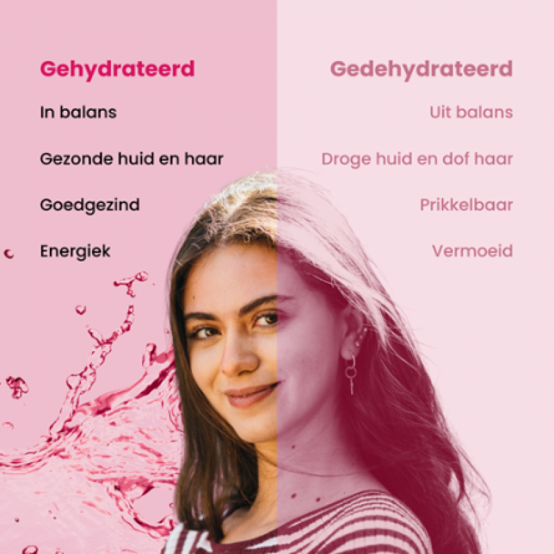 Frambozenpoeder (Rubus idaeus-vrucht), Fibruline™ chicoreivezelpoeder (Cichorium intybus-wortel), natuurlijk frambozenaroma, magnesiumcitraat, citroenzuur (zuurteregelaar), rode bietensappoeder (Beta vulgaris-vrucht), brandnetelextract 4:1 (Urtica dioica-blad), Greenluronic® paddenstoelpoeder (Tremella fuciformis) met 90% hyaluronzuur, MOODREAL® saffraanextract (Crocus sativus L. - stigma), zoetstof: steviolglycosides van Stevia, vitamine D3 (cholecalciferol), vitamine B6 (pyridoxine hydrochloride), Quatrefolic® vitamine B9 (5MTHF-glucosamine), vitamine B12 (methylcobalamine).