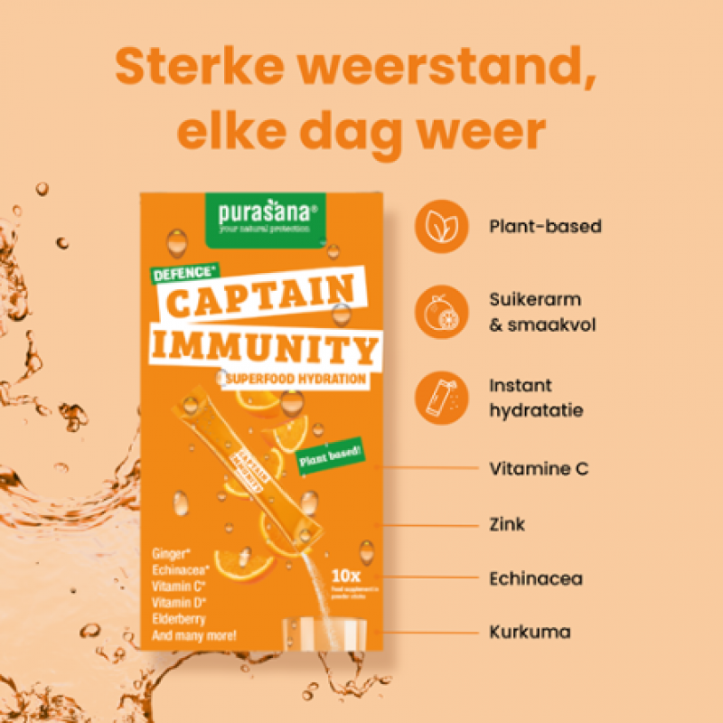 Purasana Captain Immunity bevat 100% natuurlijke ingrediënten, zonder synthetische toevoegingen. Het product is vrij van toegevoegde suikers, soja en lactose.