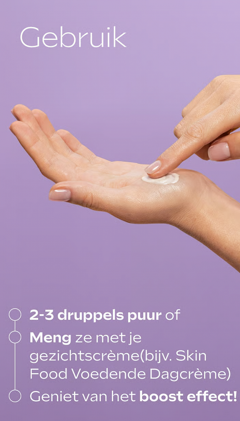 Hyaluronic Boost Serum Drops zijn een perfecte aanvulling op je gezichtsverzorgingsroutine. Jij kiest hoe je ze gebruikt: reinig eerst je gezicht en breng 2-3 druppels direct aan op je huid of meng ze met je dag- of nachtcrème. Masseer zachtjes in en geniet van een zachte, frisse gloed. Drop it! Mix it! Boost it!